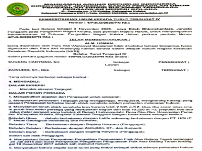 PEMBERITAHUAN UMUM KEPADA TURUT TERGUGAT IVNomor : 4/Pdt.G/2025/PN KkaPada hari Selasa tanggal 3 Nov ...
